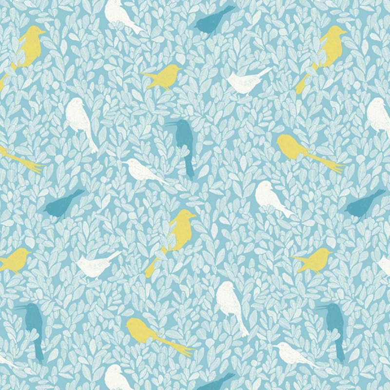 Motif ornemental à la fois présent et discret, présentant une nature chantante et surprenante où les oiseaux se dessinent dans un feuillage protecteur qui semble s’animer grâce aux vibrations du dessin fait main.